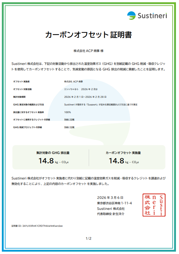 なお、2026年2月度に行ったカーボンオフセットは、14.8kg-CO2となりましたことを、ご報告いたします。